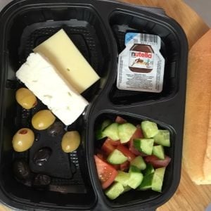 Beyaz peynir, kaşar peyniri, siyah zeytin, yeşilzeytin, Nutella, domates, salatalık, ekmek