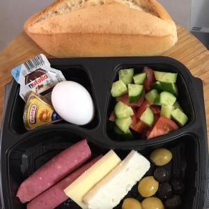 Beyaz peynir, kaşar peyniri, salam, siyah zeytin, yeşilzeytin, üçgen peynir, Nutella, domates, salatalık, haşlanmış yumurta, ekmek